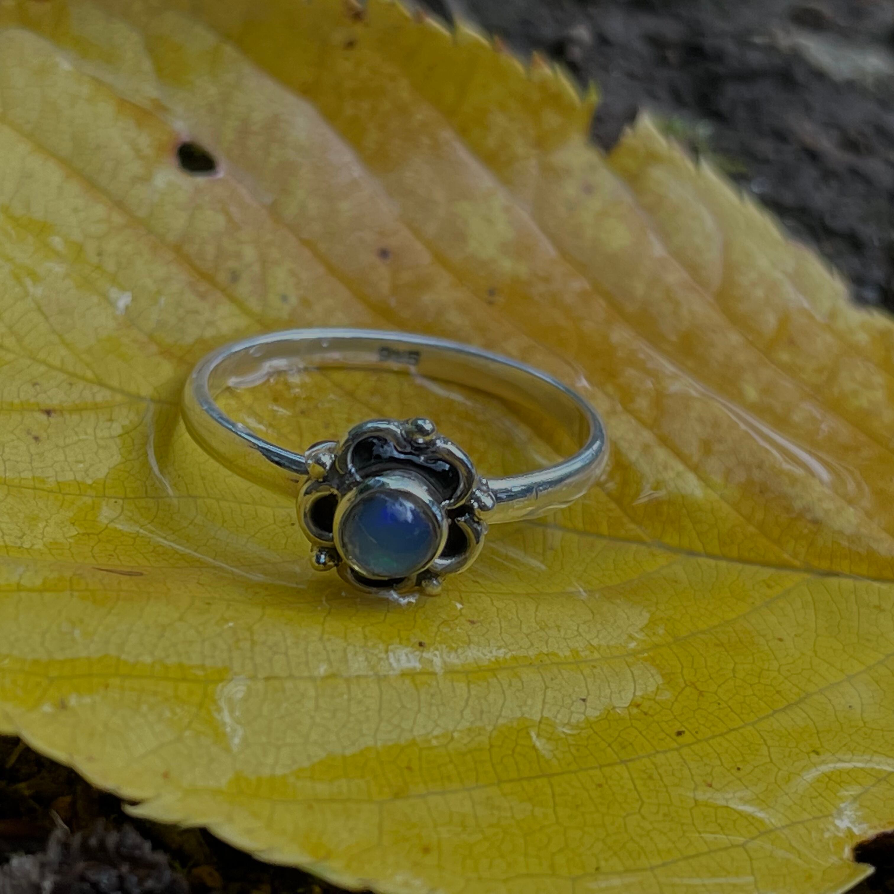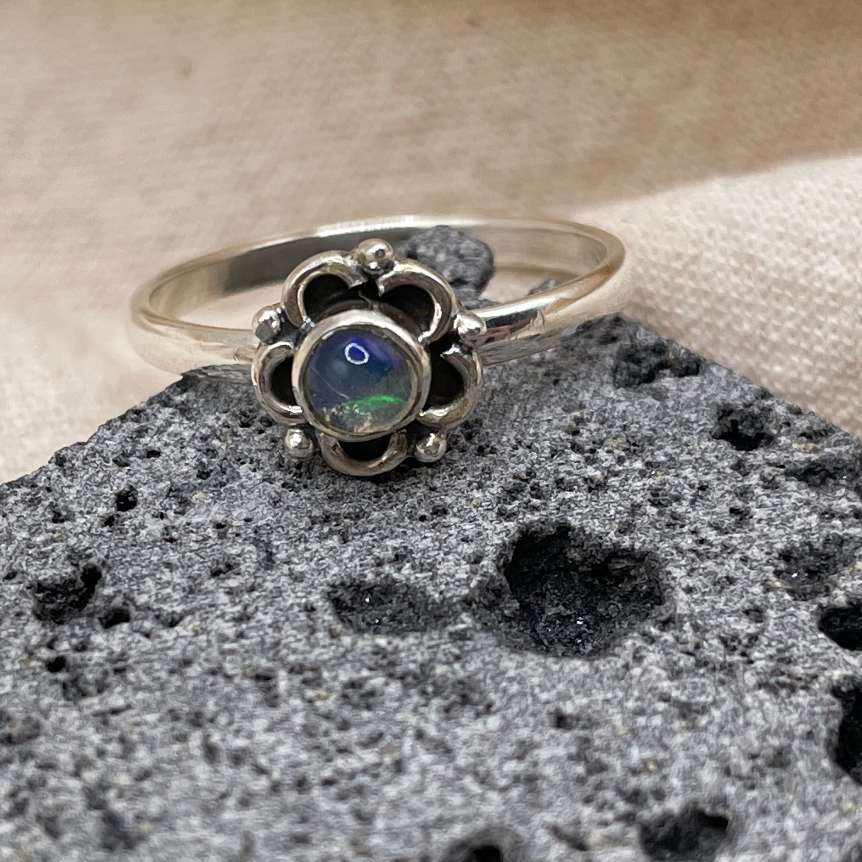 お花の中央に天然石のオパールがあしらわられたデザインが特徴のシルバーリングです。オパールはブルー基調の奥から黄緑の光が輝きます。