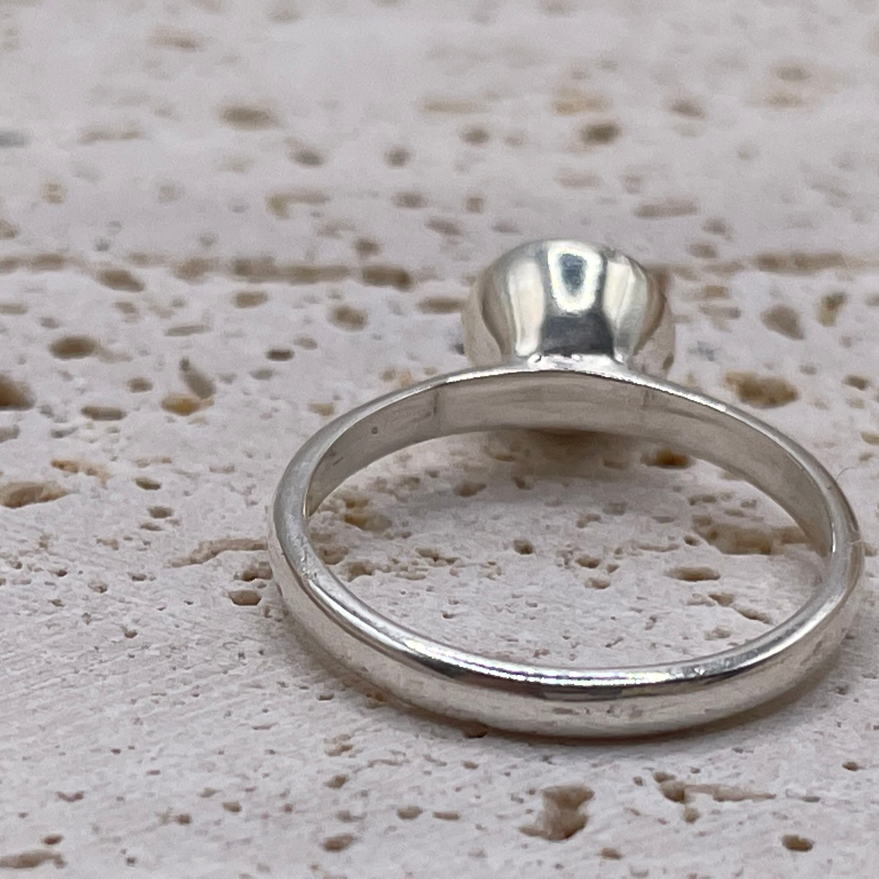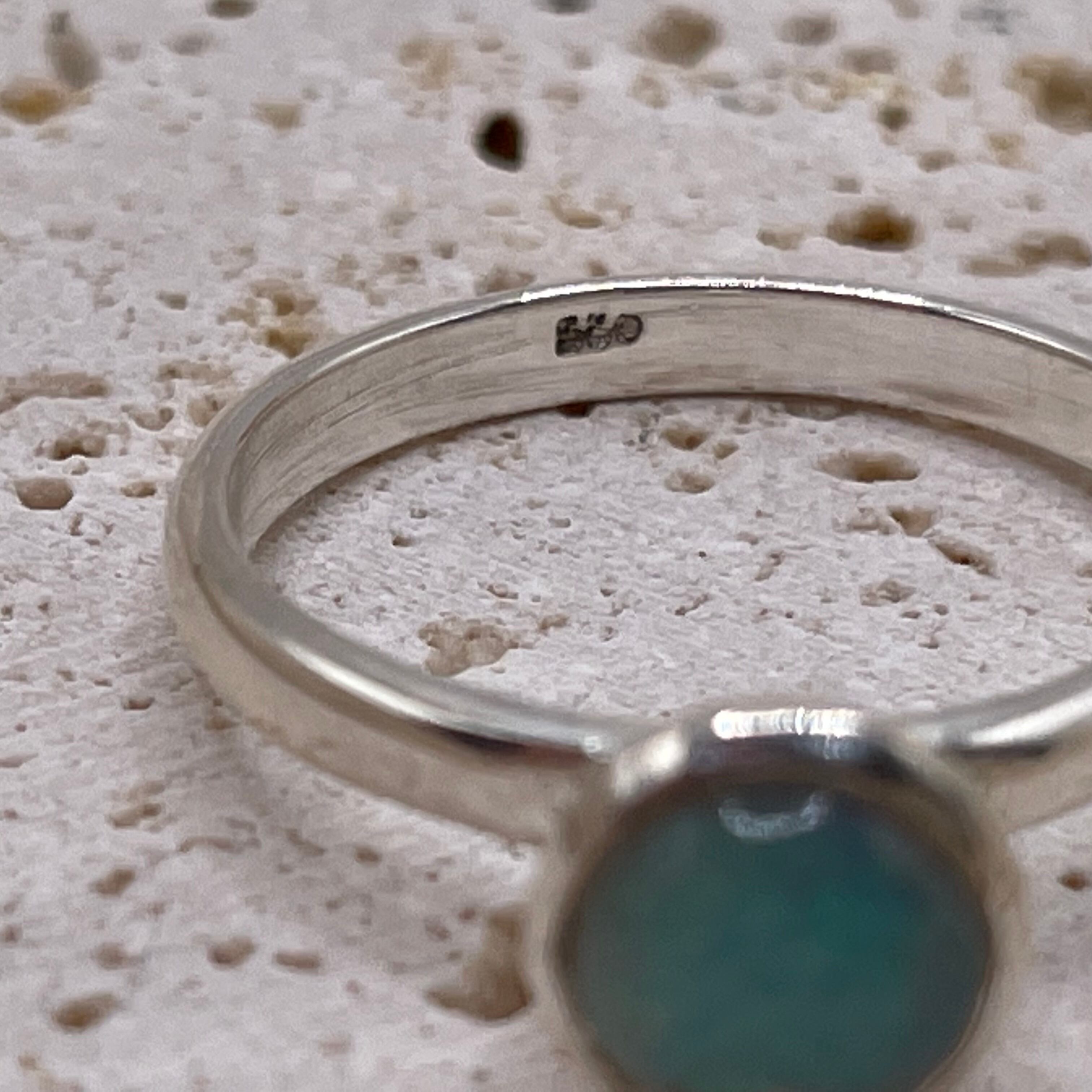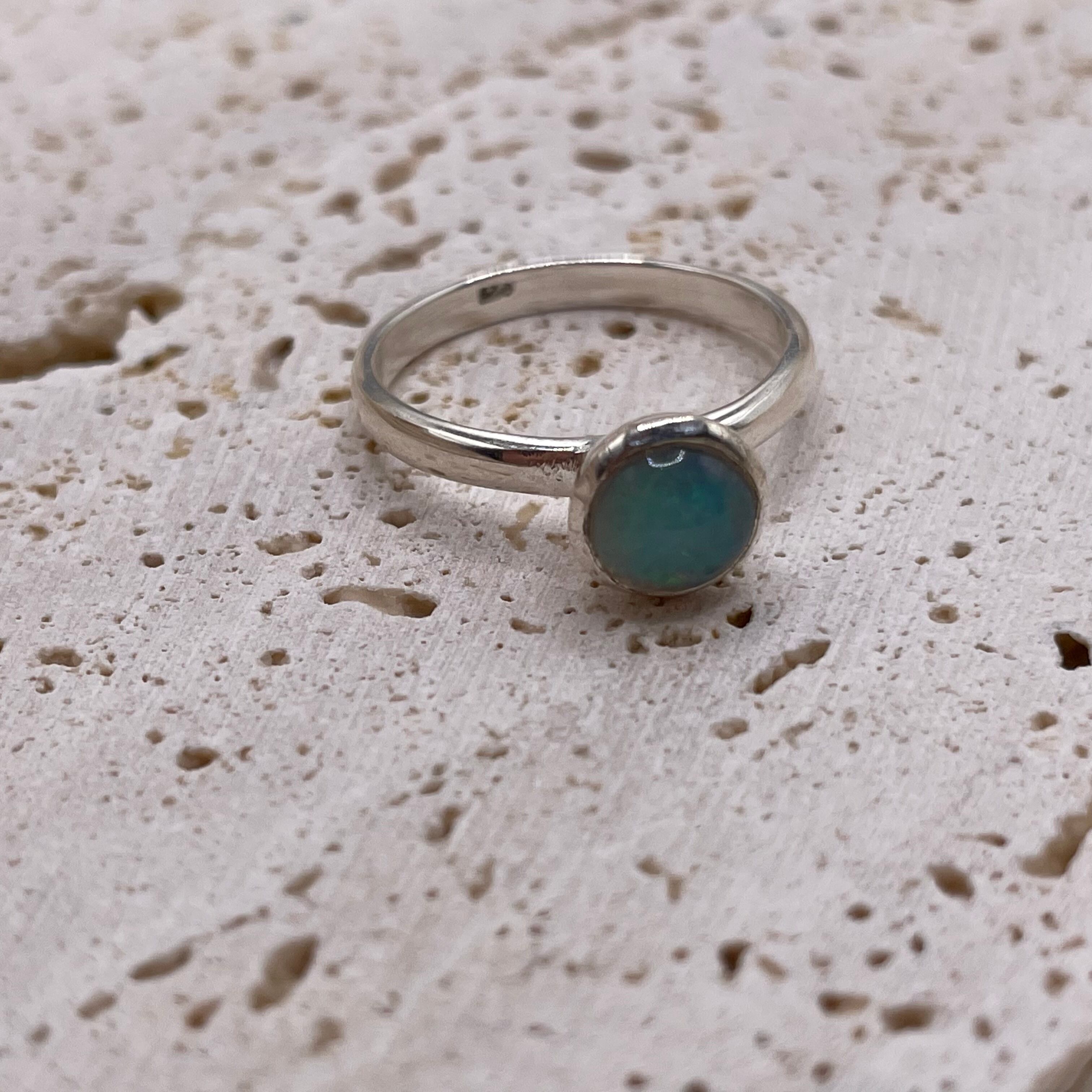 オパールの石がついたシルバーリング。シンプルなデザインのため、重ね付けもおすすめです。水色の奥から虹色の光を放つオパール。