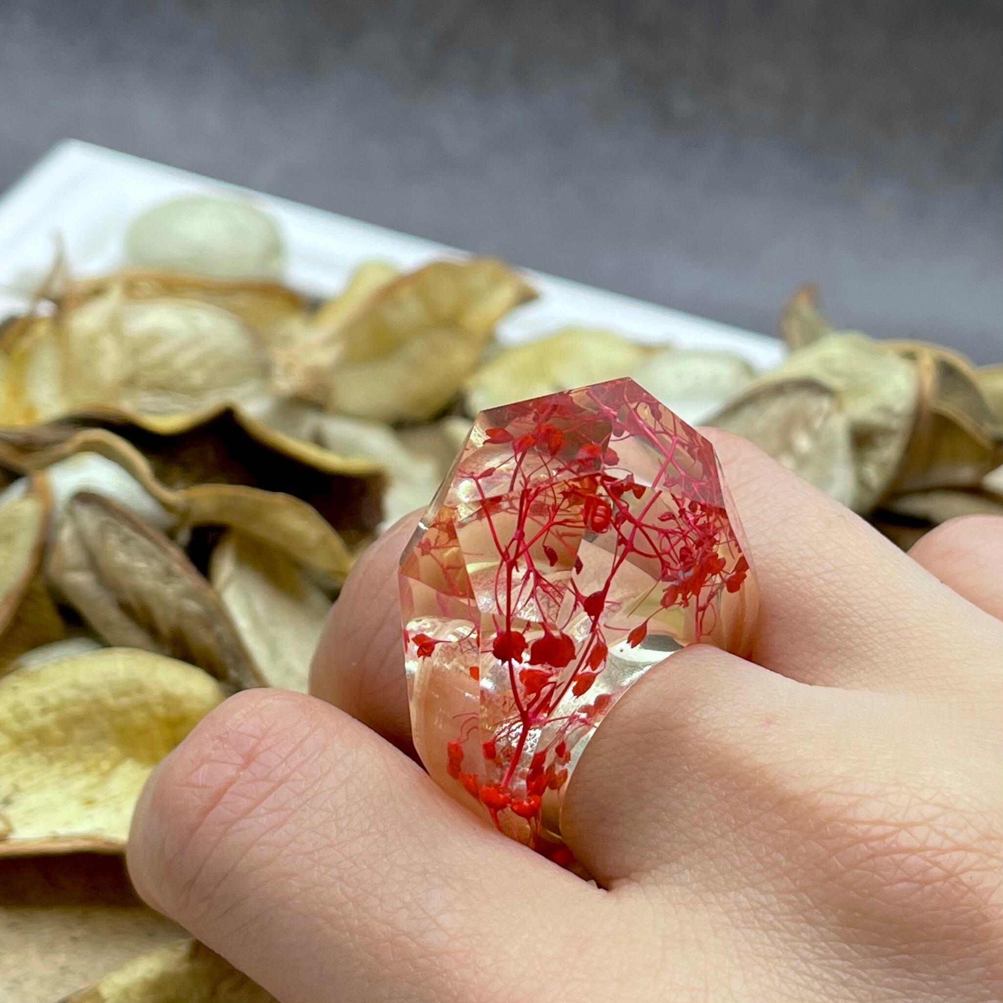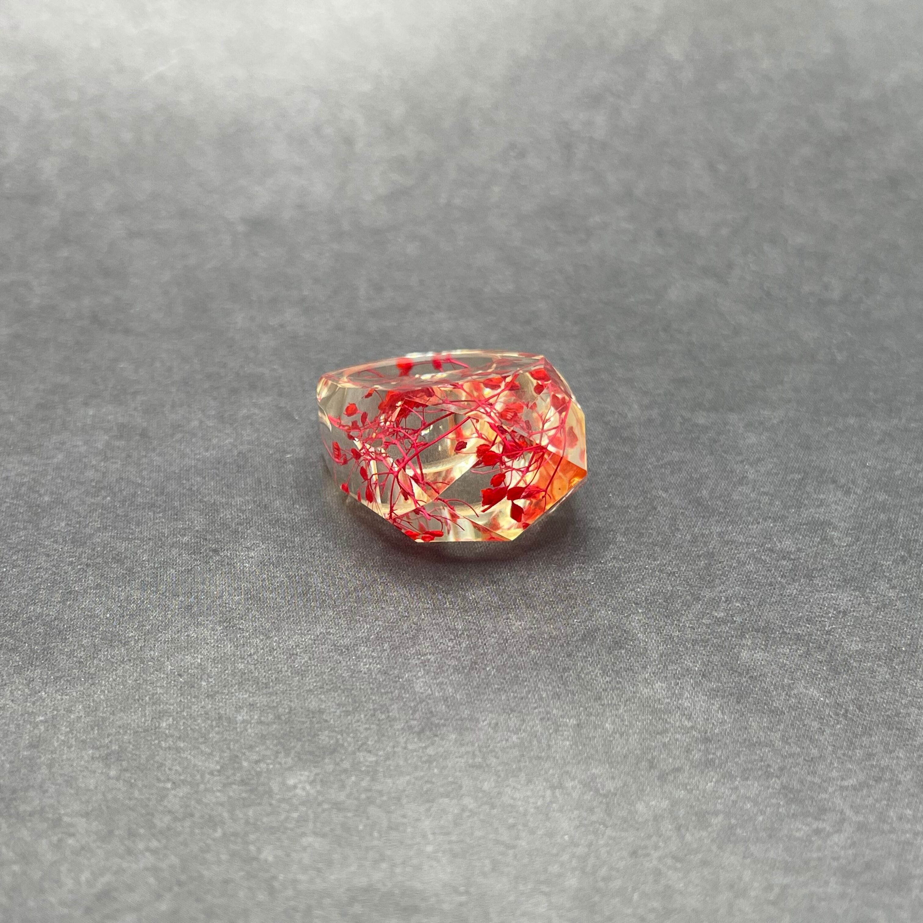 アートフラワーインレーのルーサイトリングです。赤い小花がかわいらしく、カットが独特なためおしゃれで大人っぽい印象。モードなファッションにポイントとして。